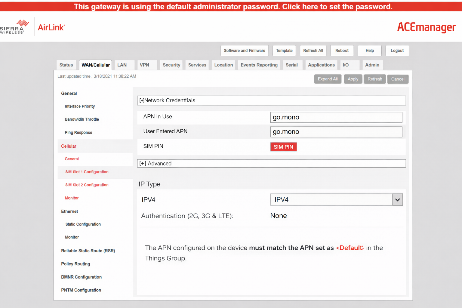 Example showing the go.mono APN used in RV50 Sierra Wireless AirLink modem