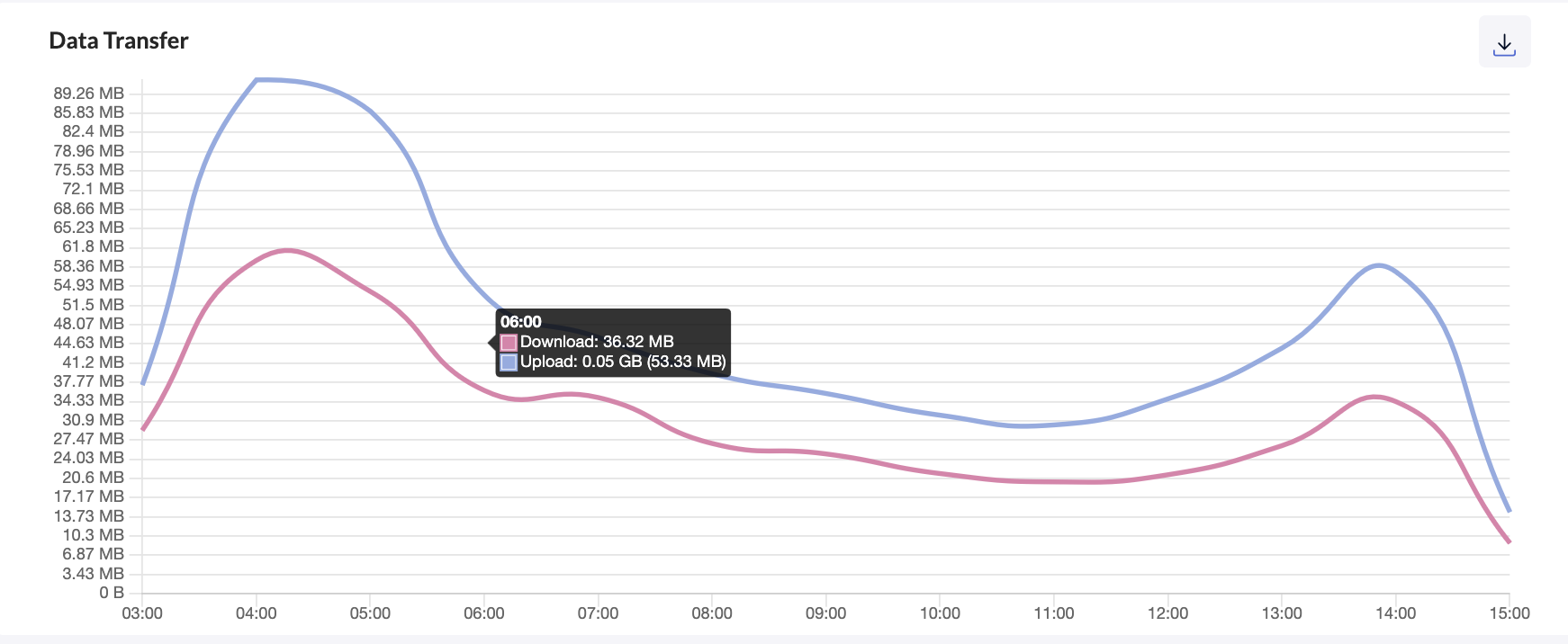 The **Data Transfer** graph shows the download and upload IP traffic for the selected period. In case you want to change the shown period, then please check out the information about filters.