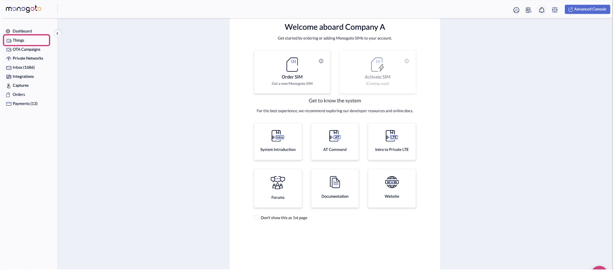 In the Thing details page, locate and click on the "Advanced Console" button.