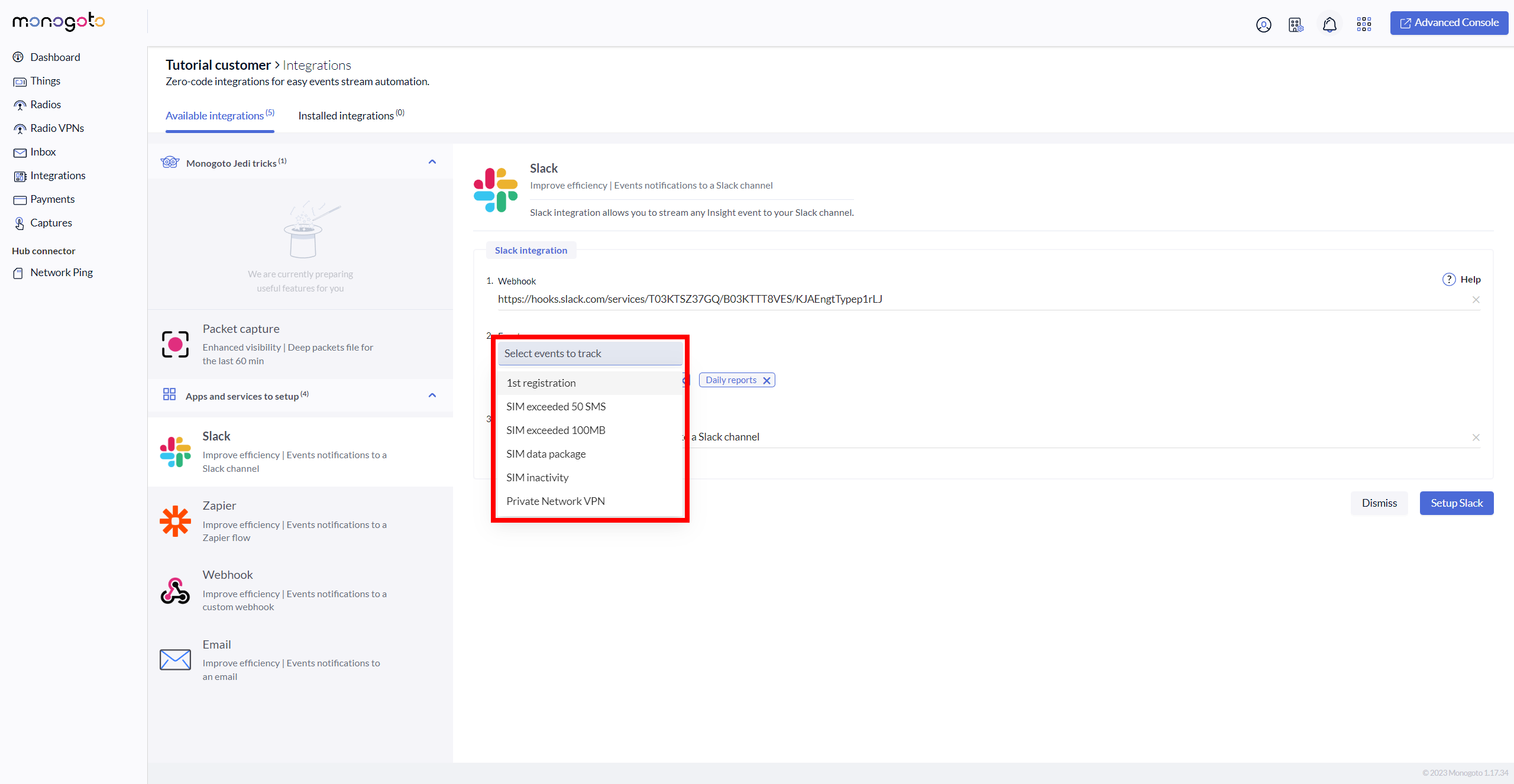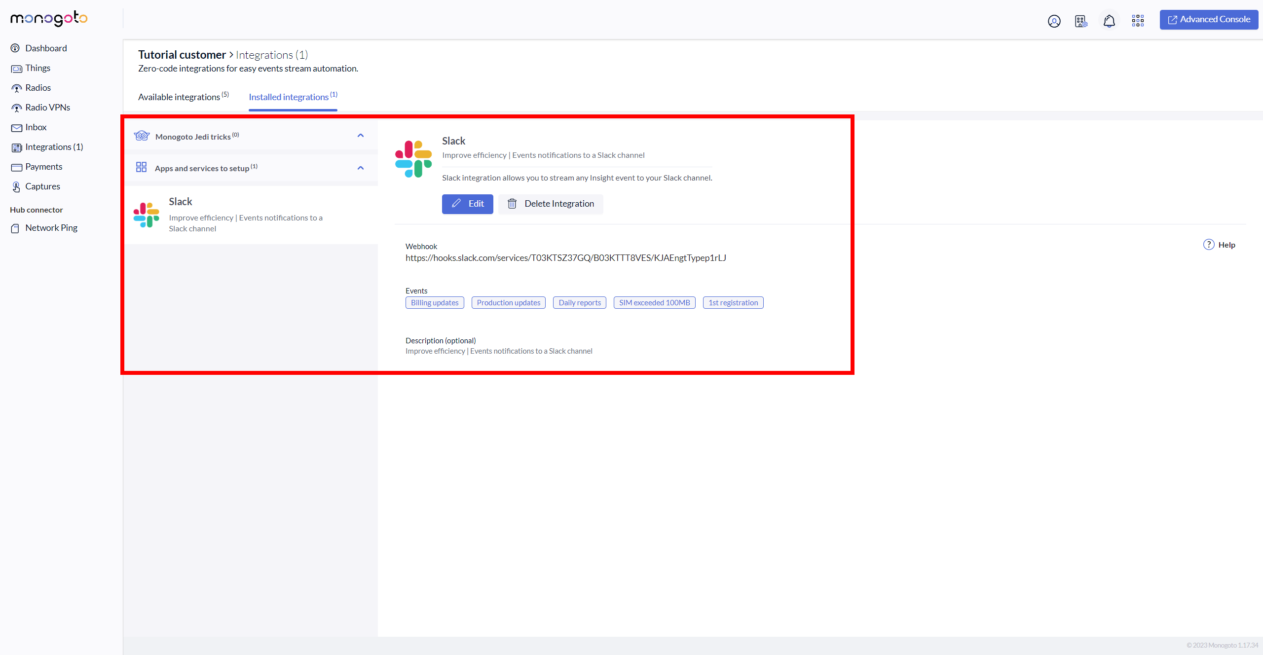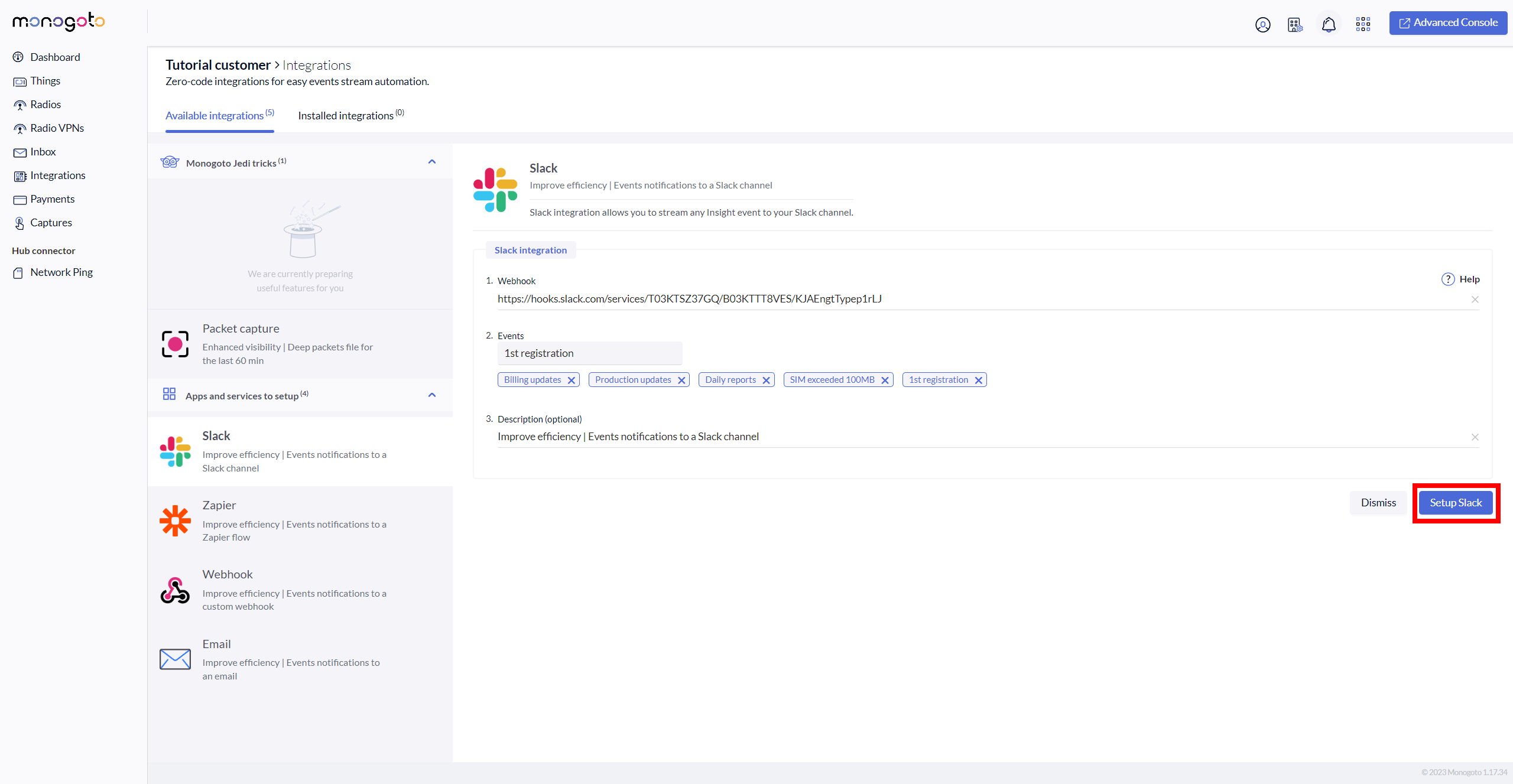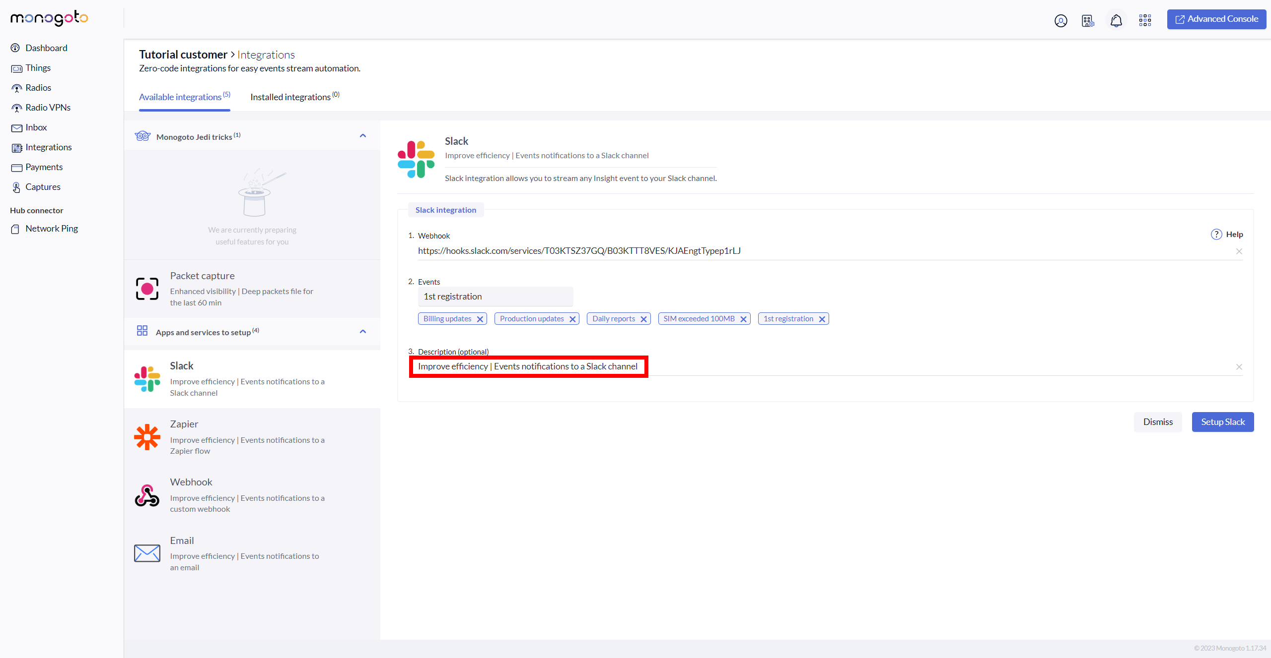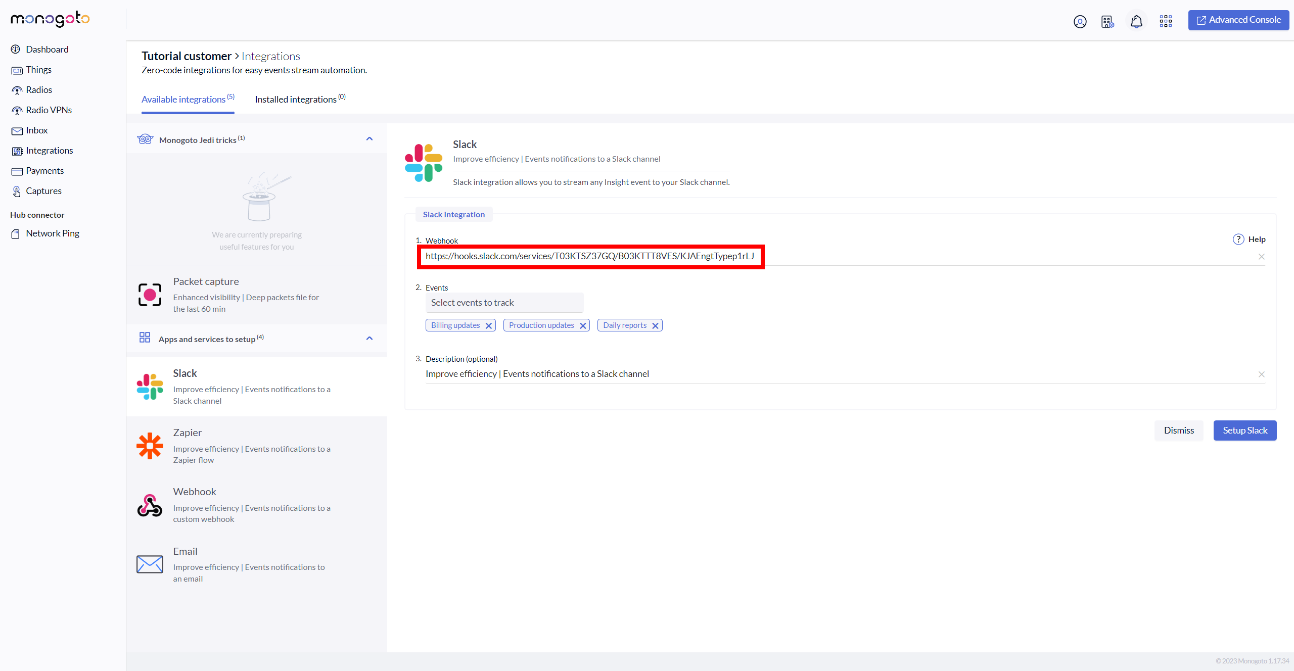 17\. Go back into your Monogoto hub where you have started the **Slack** integration and enter/paste Slack webhook.