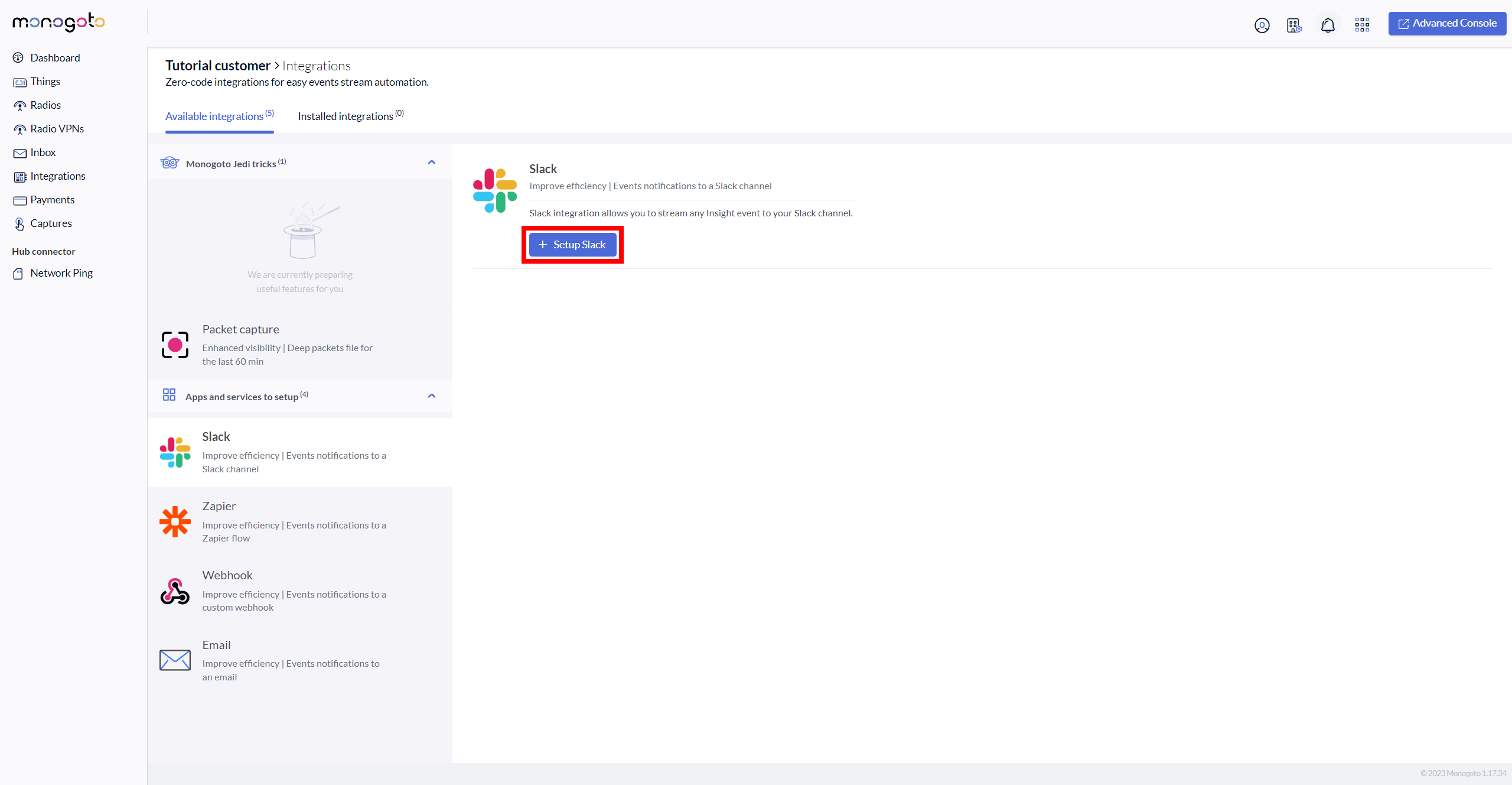 3\. From available integrations list please press on **Slack** option.