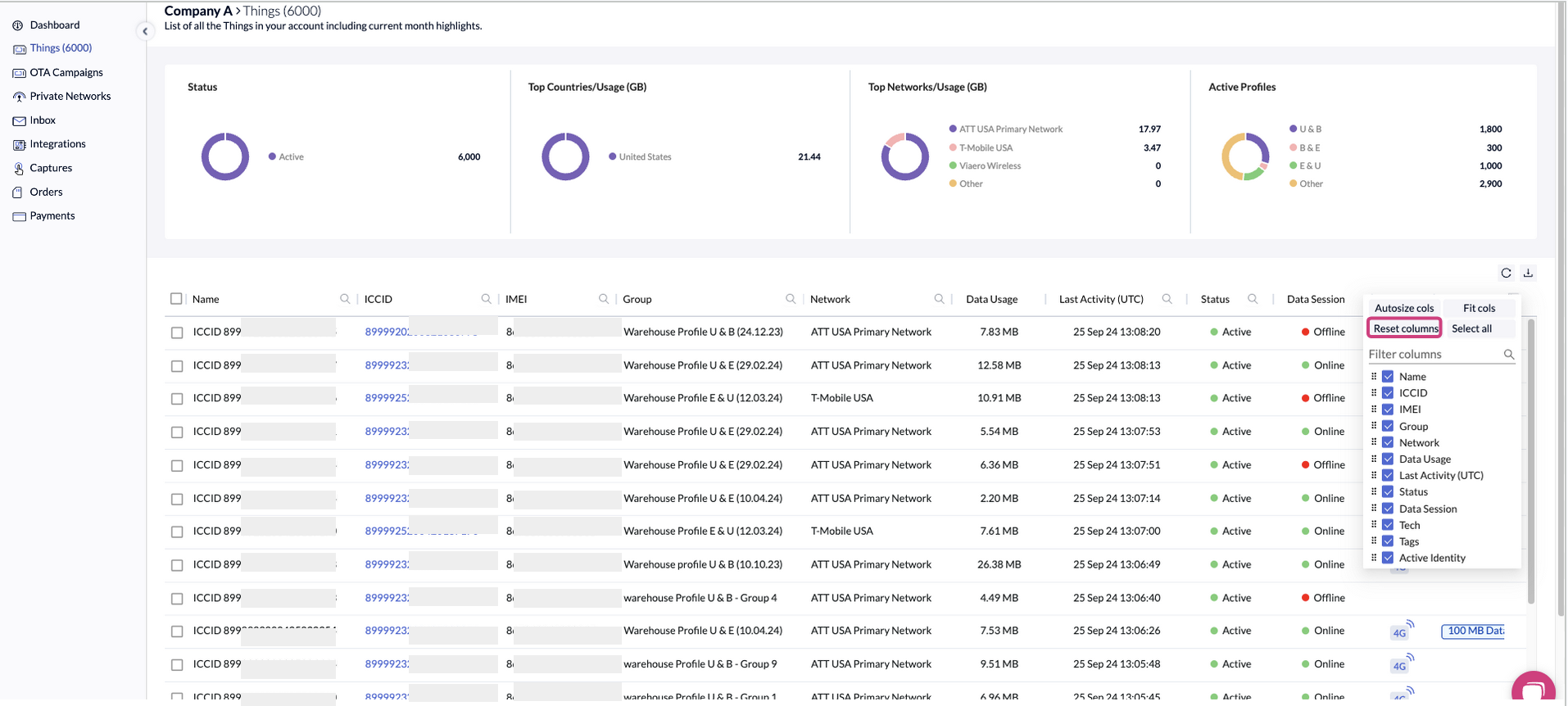 The **Things** page provides a detailed view of all the things (SIMs) under the account.&#x20;