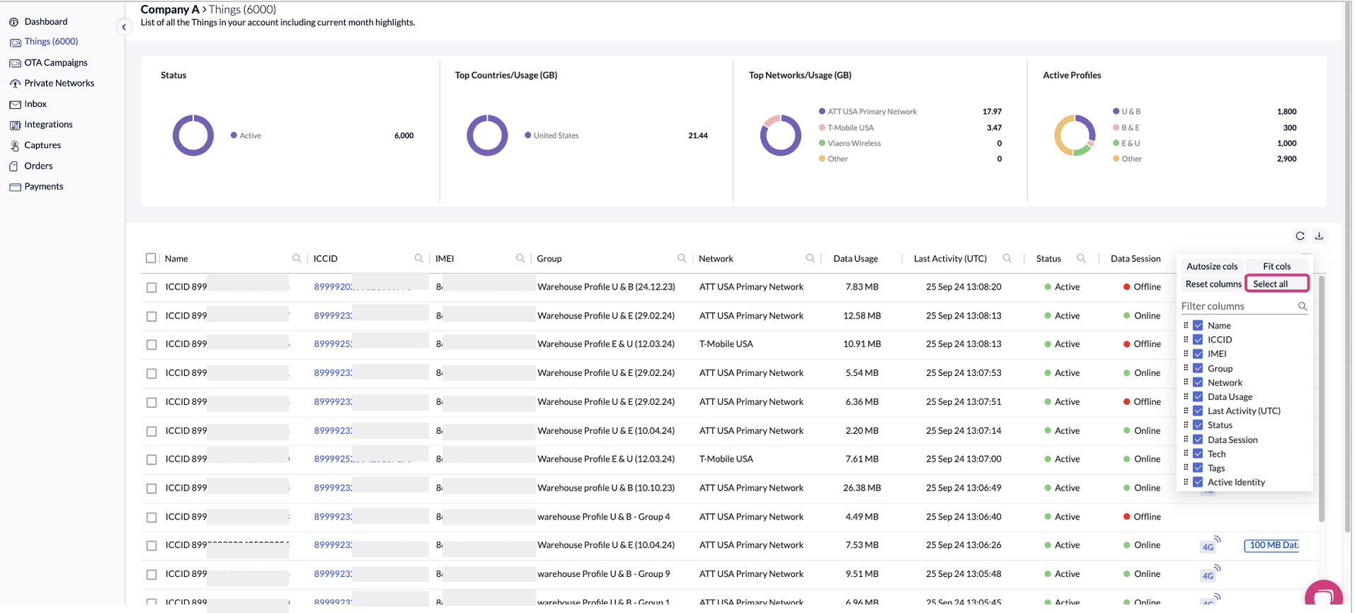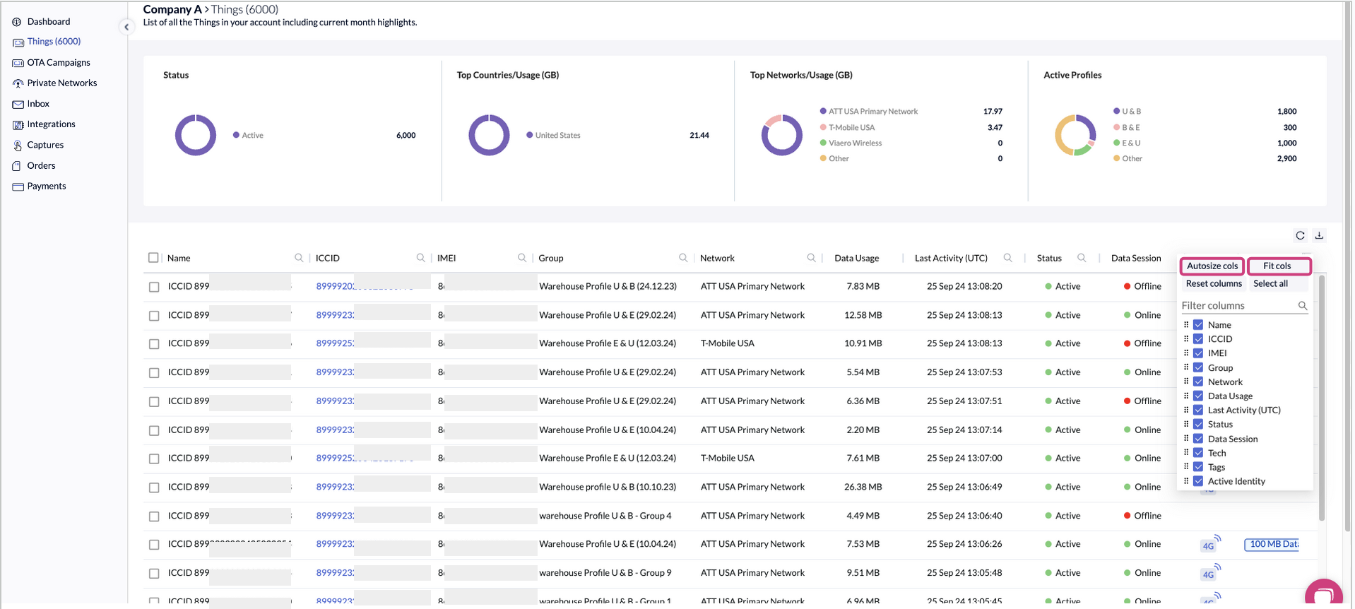 The Things table presents detailed information about your things (your SIM cards), organized into columns for easy reference and analysis. The columns include important information that will be helpful at a first sight of the table, for example the Thing’s name, last network that has been used, etc.