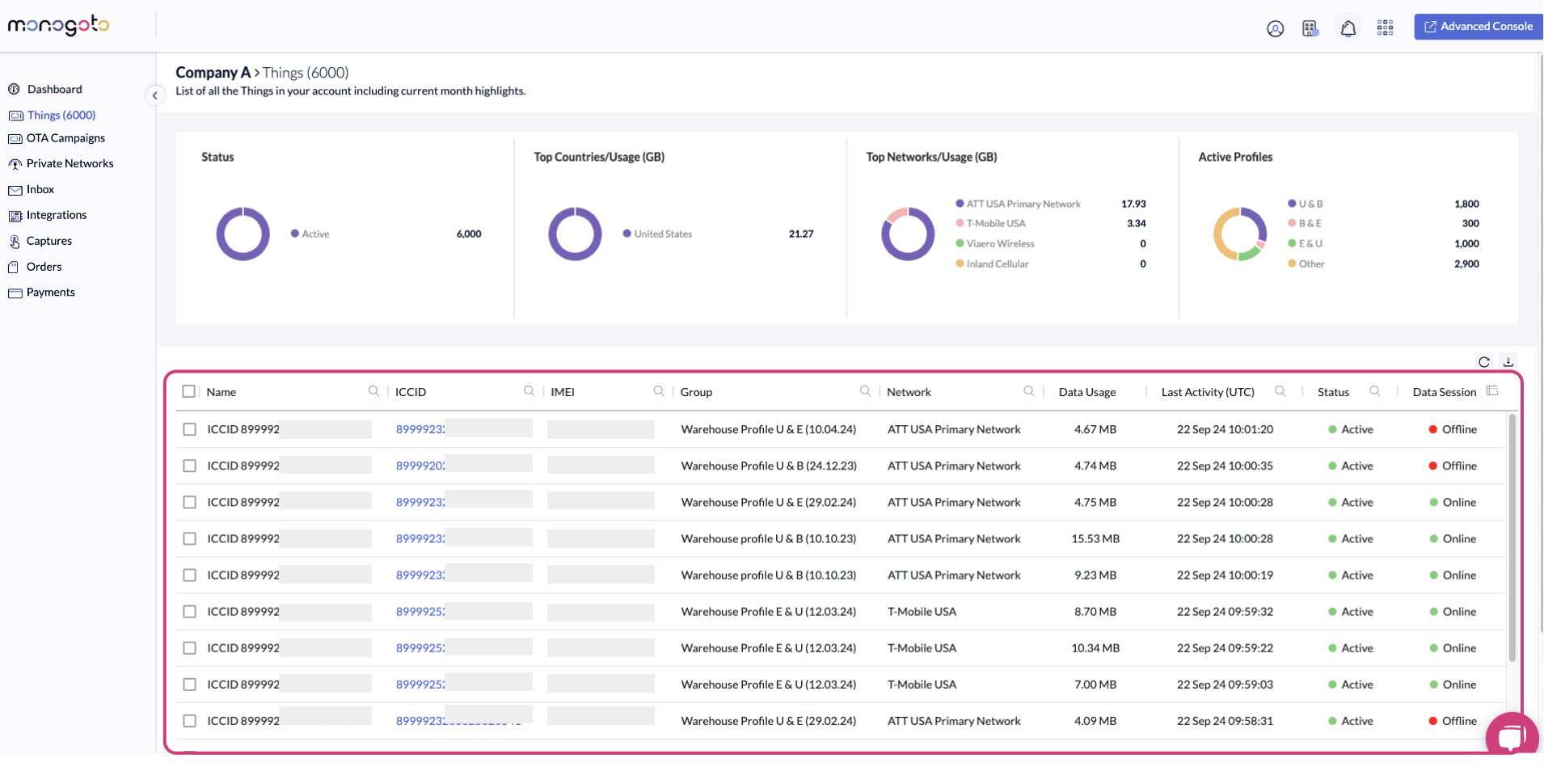 **Profiles:** This chart shows the most frequently accessed or active [SIM identities](https://docs.monogoto.io/getting-started/cellular-identities) within the current month.