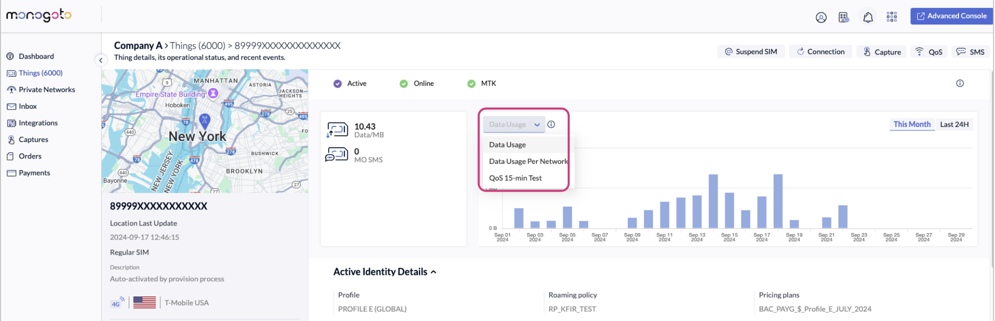 This tab displays information about the current active identity, including the active profile, the applicable roaming policy, and the assigned price plan.