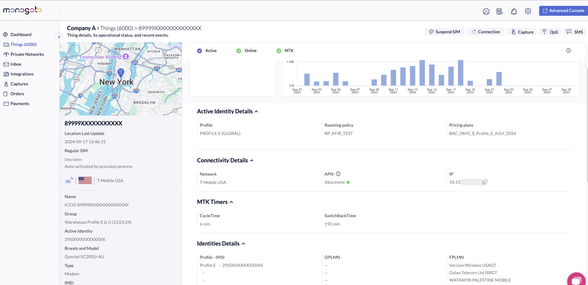 **Capture:** Lets you capture all outgoing and incoming IP traffic from your chosen Thing, and will generate a PCAP file for a specific Thing, including all data traffic routed via Monogoto over the past 60 minutes. Capture is available only [upon activation](https://docs.monogoto.io/hub/captures), and if the SIM’s active.
