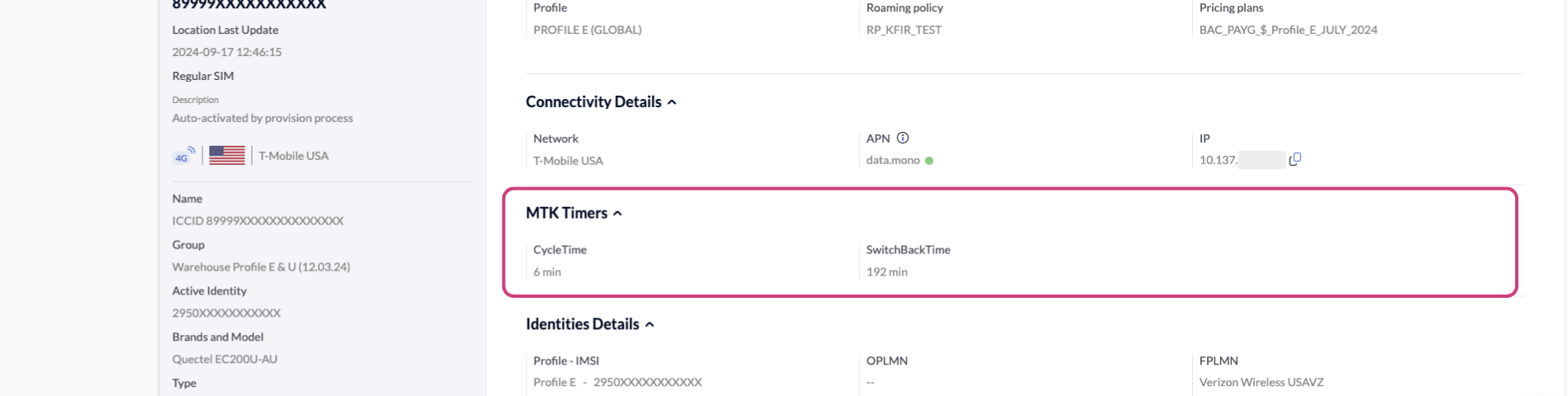 In addition, it displays the *SwitchBackTime* value - the duration (in minutes) which triggers the MTK to switch the SIM to the primary identity, only if it was connected continually for this duration.&#x20;