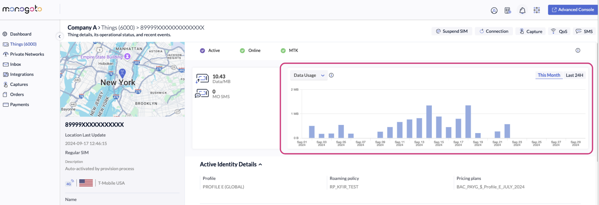 In the left sidebar of the page is displayed useful data regarding your thing, including the Thing’s ICCID, the SIM type, a description of the thing, the tech and network in use, the group the SIM belongs to, the active identity in use and information about the device the thing is in - the IMEI and the brand and model of the device.