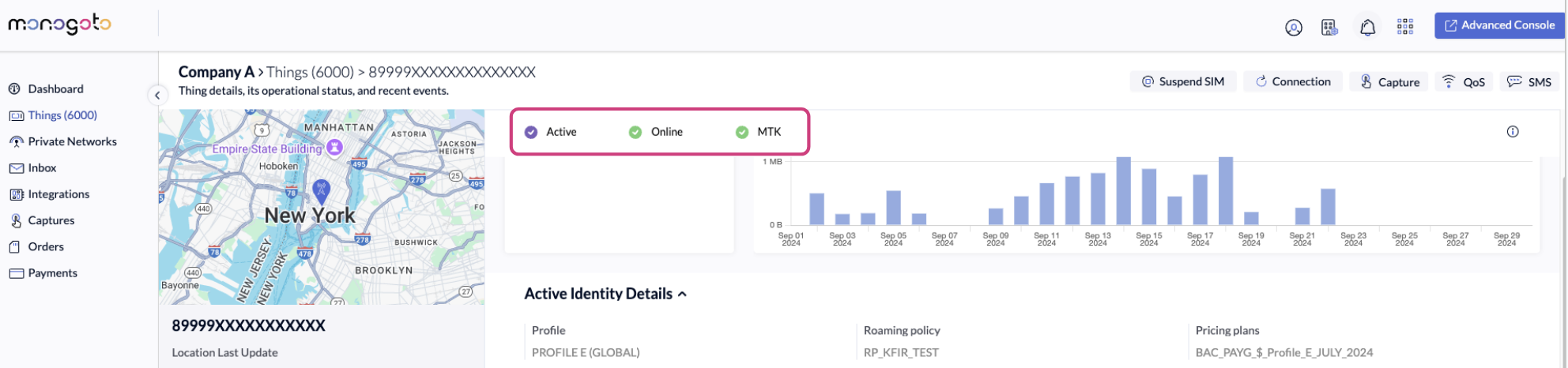 **MTK indicator:** Shows whether the Monogoto SIM Tool Kit (MTK) is installed. The MTK was designed to optimize network connectivity.