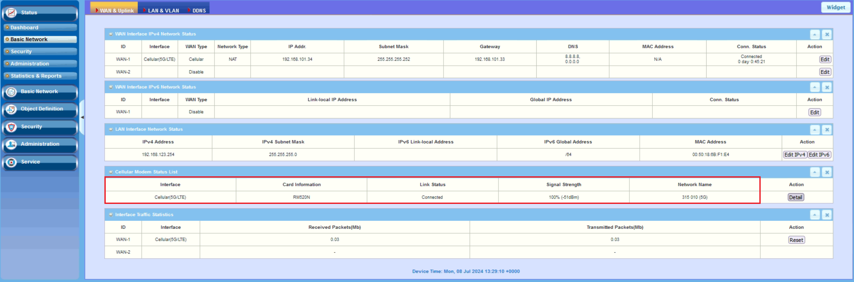 Open up the **Status** Menu -> **Basic Network** -> **Wan & Uplink** validate the connection with Monogoto's private network. If the connection was successfully established, the Link Status reports: **Connected**